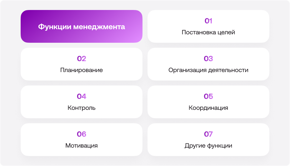 • Управление. Руководит и мотивирует сотрудников, отвечает за принятие решений. Эта функция направляет усилия персонала на достижение целей и поддерживает рабочую дисциплину.