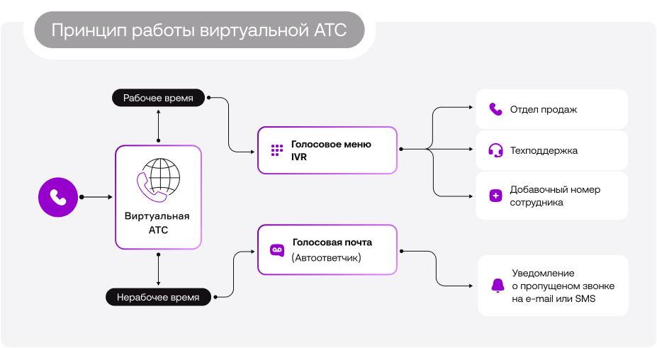 Виртуальная автоматическая телефонная система (АТС) — это облачный сервис, умеющий управлять звонками онлайн. С помощью виртуальной АТС можно: